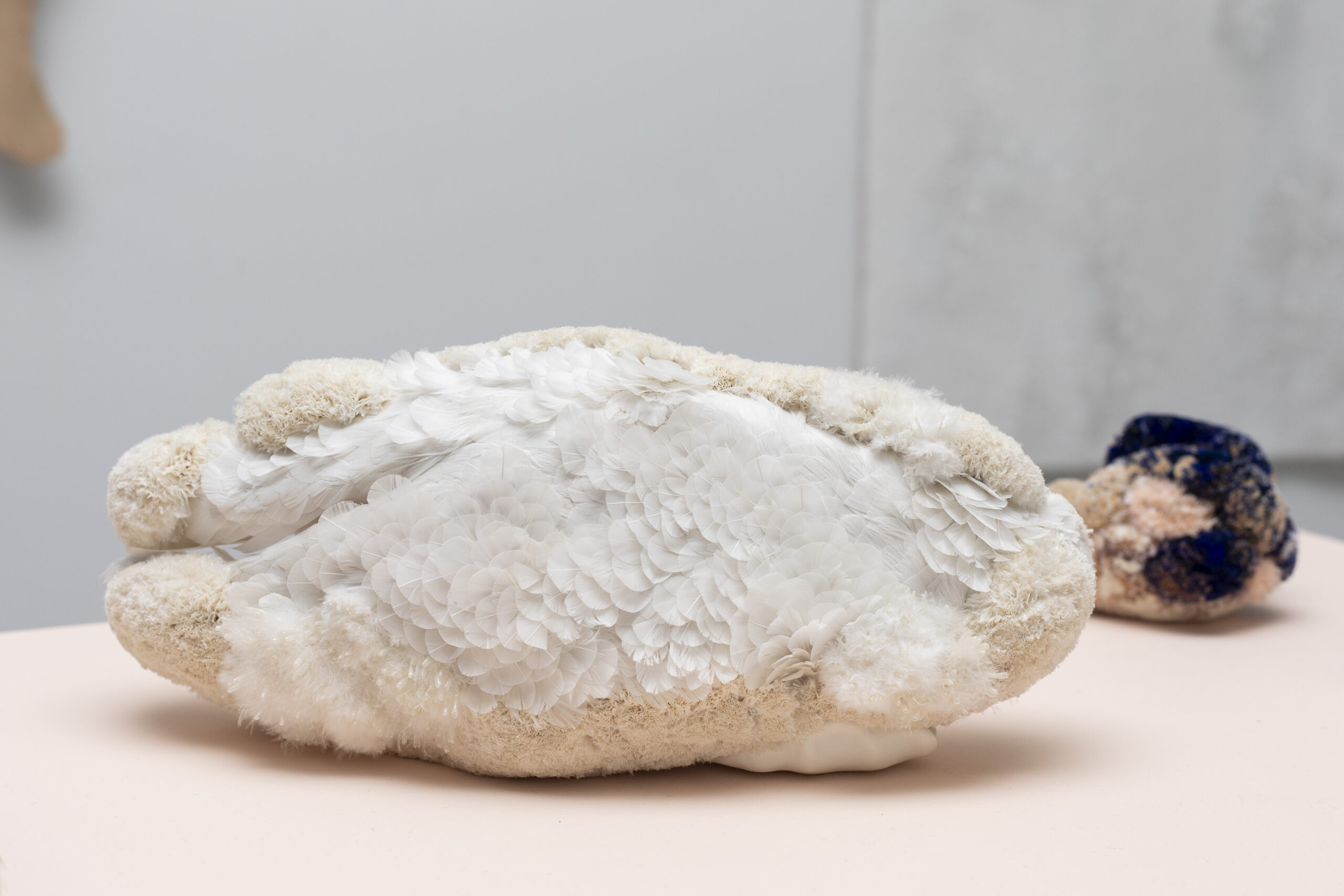 Artiste textile et plumassière, Estelle Garcia Blanco combine installations et tableaux-sculptures. Elle explore la figure de l’oiseau, à la fois comme image poétique et comme incarnation du désastre écologique. Sa pratique se concentre sur la plume en tant que matériau symbolique. Elle capture le mouvement du vivant, témoigne du sauvage et représente aussi la mort. Ce qui n’existe plus mais laisse une trace, une mémoire. À travers son travail, elle réunit les mondes animal et humain, mélangeant plumes et textiles pour révéler la tension entre ces deux univers. Ses œuvres détournent des objets usuels – plumes d’oreillers de seconde main, fragments textiles – pour en faire des témoins de notre époque, où le recyclage devient un acte de mémoire et de résistance. Les plumes, délicatement insérées ou compressées, s’entrelacent aux formes minérales du plâtre, questionnant les limites entre nature et artifice, entre légèreté et pesanteur. Ce travail, intime et universel à la fois, invite à une réflexion sur la manière dont nous habitons le monde et sur la mémoire que nous en laissons. Il s’agit d’une tentative de capter l’éphémère, d’évoquer les traces – souvent invisibles – que nos gestes inscrivent dans le paysage.